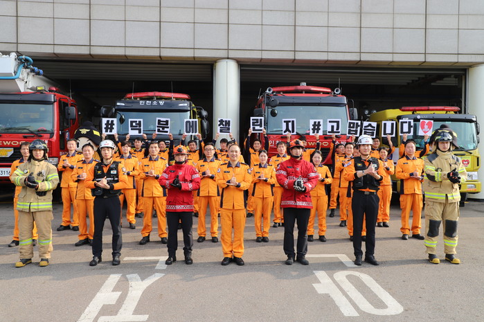 인천 남동소방서가 최근 코로나19 최일선에서 힘쓰는 의료진과 사회적 거리두기로 힘든 시간을 보내고 있는 국민들을 응원하는 '덕분에 챌린지' 캠페인에 동참했다. 사진은 존경과 자부심을 뜻하는 수어 동작인 오른쪽 엄지 손가락을 들며 기념촬영하는 소방대원들의 모습. (사진제공=남동소방서)