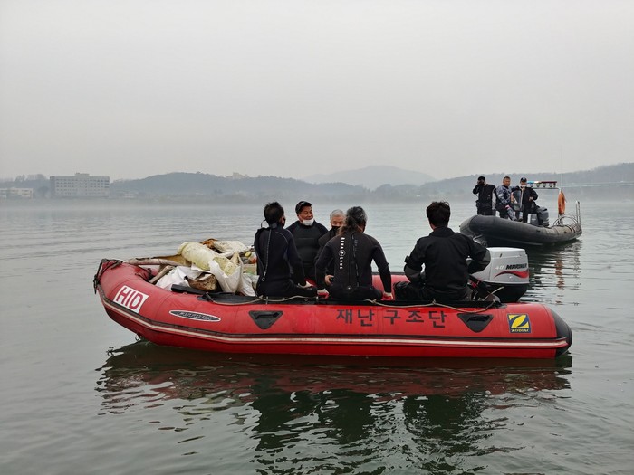 대한민국 특수임무유공자회 경기도지부 여주시지회는 18일 여주시 수상센터에서 남한강 일원 수중 및 수변 정화활동을 실시했다. 이날 참여자들은 남한강 주변에 버려진 쓰레기 제거 및 수중 부유물 등 쓰레기를 잠수장비를 이용해 집중 수거했다. 사진은 봉사자들이 수중 및 수변 정화활동을 하고 있는 모습. (사진제공=여주시청)