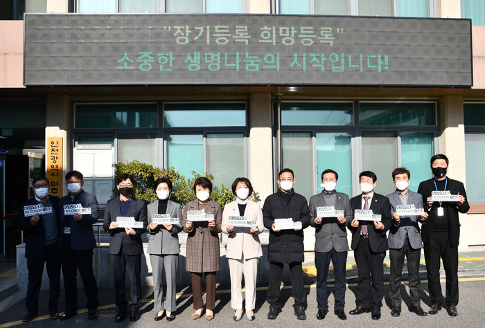 [인천=문찬식 기자] 인천 미추홀구의회가 최근 사랑의 장기기증 희망등록서에 서약한 의원들과 의회사무국 직원들과 함께 생명 나눔 실천을 위한 '장기기증 희망등록' 캠페인을 전개했다.