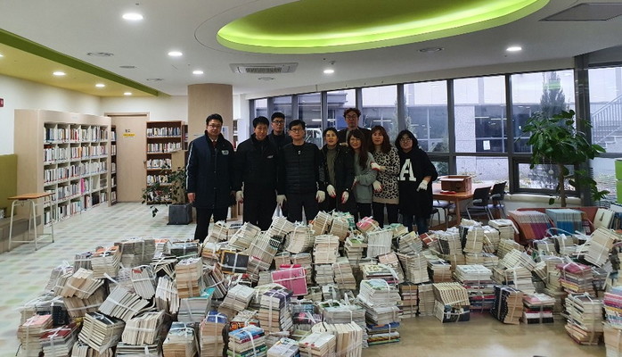 경기 안산시 단원구 대부동 행정복지센터는 최근 주민자치센터내 이용률이 저조했던 도서 열람실의 용도 변경 및 리모델링으로 인해 폐기되는 제적도서 6000여권을 중앙동 소재 센트럴 푸르지오 작은도서관에 기증했다. 사진은 기념촬영을 하는 모습. (사진제공=안산시청)