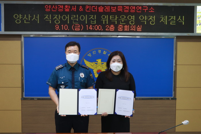 양산경찰서(서장 정성학)에서는, 지난 9. 10.(금) 경찰서 2층 접견실에서 지난달 ‘선정심사위원회’에서 선발된 킨더슐레보육경영연구소와‘양산경찰서 직장어린이집 위탁운영 약정서 체결식’을 가졌다.