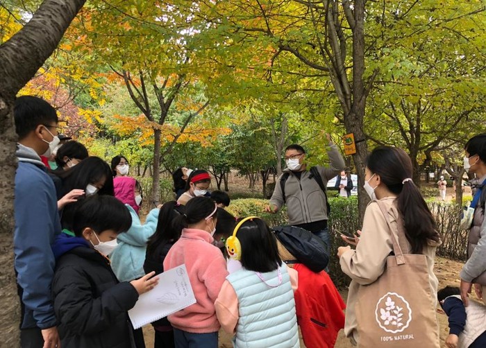 경기 구리시 갈매작은도서관은 최근 작은도서관 문화가 있는 날 ‘구릉산 숲 놀이’ 프로그램을 실시해 갈매동을 대표하는 구릉산의 생태와 역사 등에 대해 배우고, 다양한 자연 체험 숲 놀이를 직접 체험했다. 사진은 이날 구릉산 숲 놀이에 참여한 어린이와 보호자들을 대상으로 프로그램이 진행되고 있는 모습. (사진제공=구리시청)