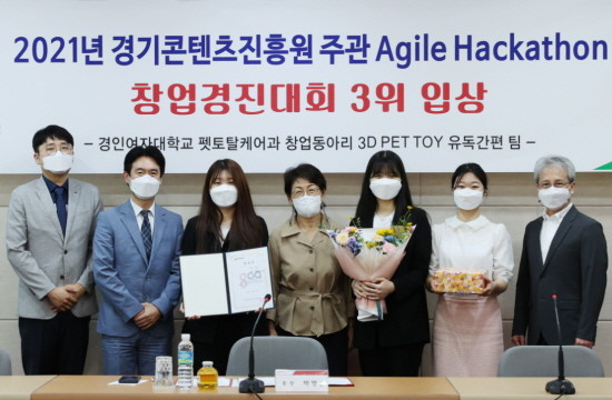 | ▲경인여자대학교 펫토탈케어과 ‘애자일 해커 톤 창업경진대회’3위 입상 시상식에 참여한 관계자들이 기념촬영을 하고 있다. |