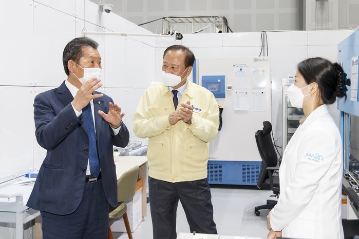 유동균 서울 마포구청장과 정청래 국회의원은 지난 1일 마포구민체육센터에 마련된 코로나19 백신 예방접종 센터를 방문해 의료 관계자들을 격려하고 진행상황을 점검했다. 사진은 유 구청장(가운데)과 정 의원이 현장 의료진과 대화를 하고 있는 모습. (사진제공=마포구청)