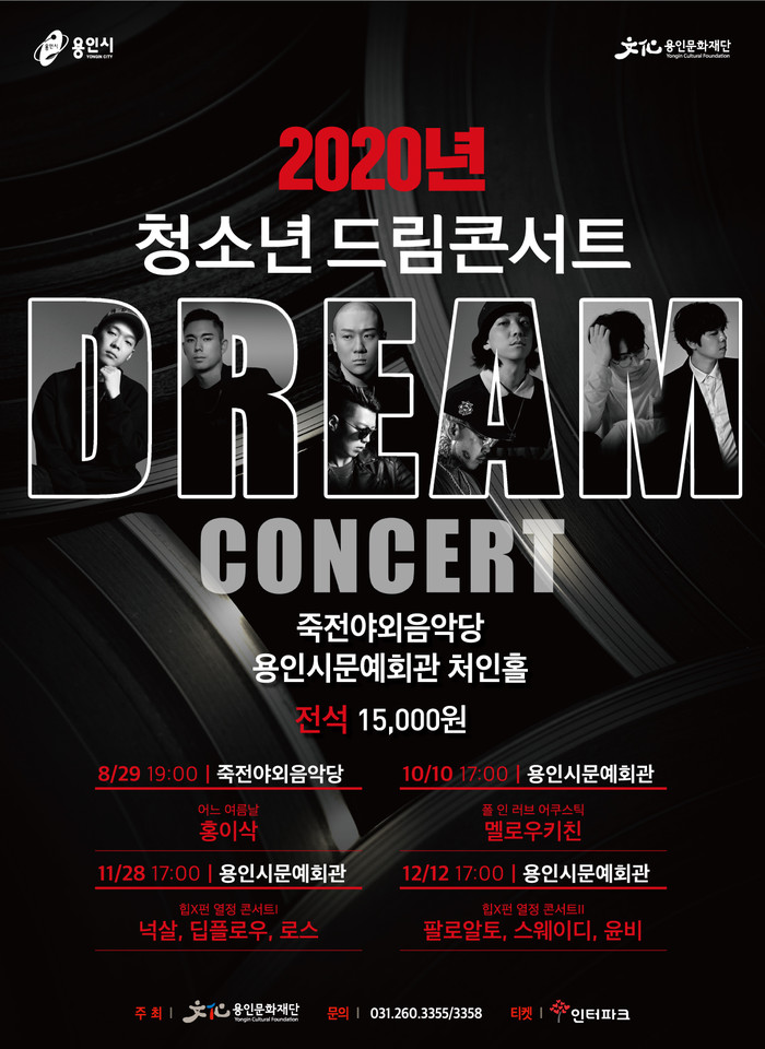 올해 첫 선을 보이는 <청소년드림콘서트>는 지난해까지 클래식 위주의 공연을 선보였던 <청소년 문화충전소>의 주요 장르와 콘셉트를 변경해, ‘힙합’과 ‘밴드음악’을 필두로 하여 청소년이 함께 공감하고 즐길 수 있는 무대로 새롭게 구성했다. 용인문화재단이 야심차게 준비한 <청소년드림콘서트>는 청소년을 대상으로 하는 공연 특성에 맞춰, 보다 많은 청소년이 콘서트를 즐길 수 있도록 1만 5천원이라는 저렴한 티켓 가격을 책정했다. 공연을 통해 문화적 갈증을 해소할 수 있는 소중한 시간이 될 것이다.