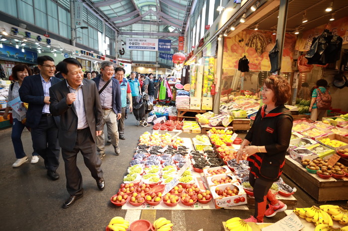 이성 구로구청장이 지난 9일 추석을 앞두고 전통시장 활성화를 위해 구청 직원들이 전통시장을 방문, 물품 구매, 시장 홍보 등을 하는 ‘장터 달구미’ 행사를 열고 지역 전통시장을 방문해 상인들을 격려했다. 사진은 시장을 돌며 상인들을 격려하고 있는 이 구청장의 모습.(사진제공=구로구청)