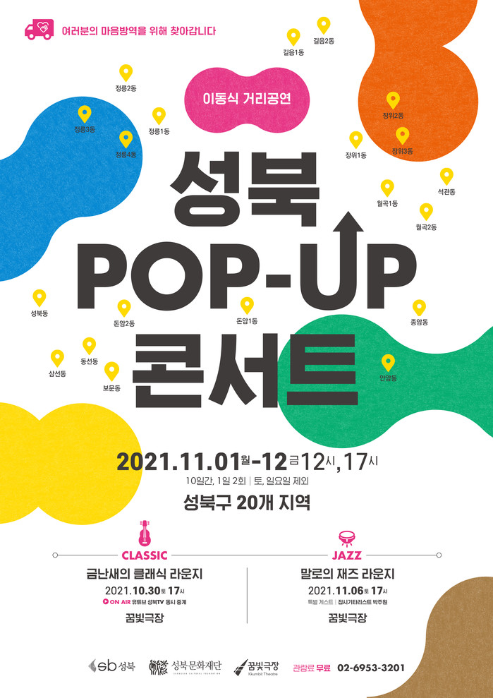 [시민일보 = 홍덕표 기자] 서울 성북구(구청장 이승로)와 성북문화재단이 오는 11월1일부터 12일까지 2주간 성북구의 20개 지역을 찾아가는 이동식 순회공연 '성북팝업콘서트'를 개최한다.