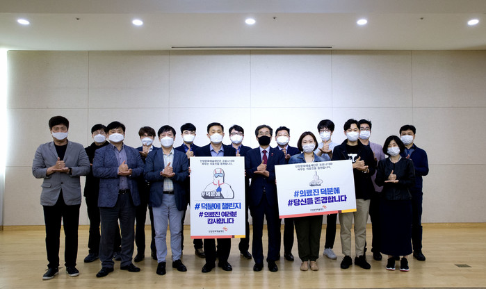 경기 안양시 문화예술재단이 지난 19일 코로나19 진료에 힘쓰는 의료진 등에게 감사와 응원의 메시지를 전달하는 '덕분에 챌린지' 캠페인에 동참했다. 사진은 박인옥 대표이사와 간부 및 직원들이 존경과 자부심을 뜻하는 수어동작으로 응원 메시지를 전달하는 모습. (사진제공=안양시청)