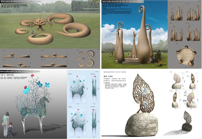 네오펜슬(최승일 외 2명) 作 <생명과 공존의 숲>은 아빠사슴(높이3m), 엄마사슴(높이1.8m), 아기사슴(1.4m) 세 마리 사슴 가족을 스테인리스로 형상화한 작품이며 산삼주제관 마당에 설치될 계획이다. 함양산삼(자연 속 생명의 힘을 가진 식물)을 생명체(사슴)와 결합하여 형상화 한 것으로 주 몸체(사슴)는 뇌두부터 주근, 가락지(세근)까지를 표현하였다. 상층으로 뻗어가는 산삼의 잎과 열매를 통해 자연의 생명성을 역동적으로 표현하고자 하였다.