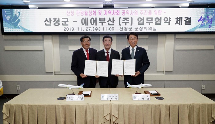 산청군과 에어부산(사장 한태근)이 지역 관광활성화와 공익사업 추진을 위한 업무협약을 체결했다.