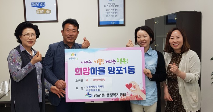 경기 수원시 영통구 망포1동은 20일 수원사랑 장학재단 태장동후원회의 후원으로 저소득층 가정 자녀 5명에게 '성년의 날' 축하금을 전달했다. 사진은 참여자들이 기념촬영을 하는 모습.(사진제공=영통구청)
