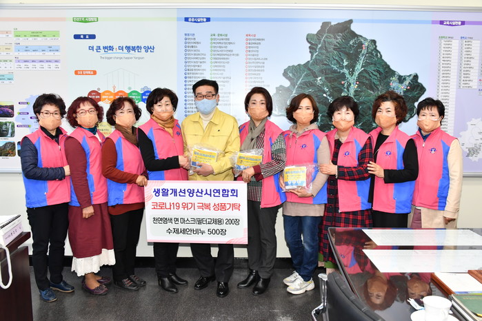 생활개선양산시연합회(회장 김영미)에서 코로나19 예방을 위해 수제 면마스크 200장과 손씻기용 천연수제비누 500개를 제작해 관내 취약 계층인 독거노인, 기초생활수급자, 저소득 식사배달 사업대상자 등 100세대에 전달했다.