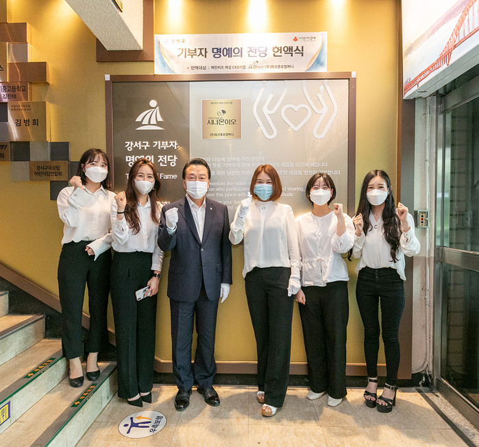 노현송 서울 강서구청장이 최근 구청 본관 2층에서 열린 ‘기부자 명예의 전당 헌액식’에 참석했다. 사진은 노 구청장(왼쪽에서 세 번째)이 명예의 전당 헌액식에서 우수 기부자로 선정된 (주)워크플로컴퍼니 관계자들과 함께 기념촬영을 하고 있는 모습. (사진제공=강서구청)