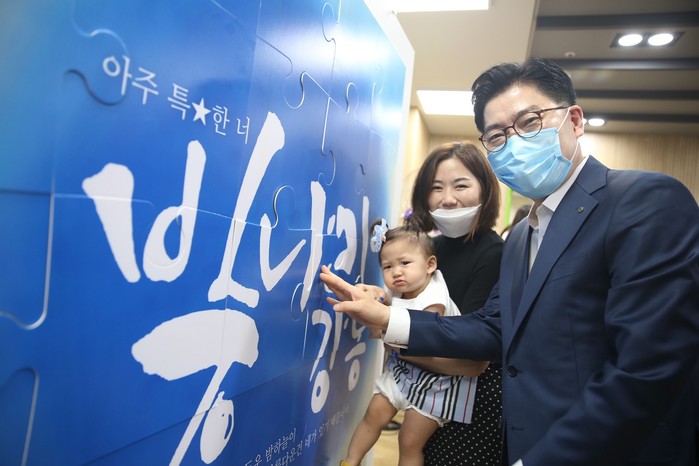 이정훈 강동구청장이 지난 1일 민선7기 2년 첫날 이른 아침 선별진료소와 치매안심센터를 방문한 뒤 커뮤니티 거점 공간인 강일2지구 커뮤니티 시설 개소식을 열었다. 사진은 개소식에서 이 구청장(오른쪽)이 한 아기와 기념촬영을 하는 모습. (사진제공=강동구청)