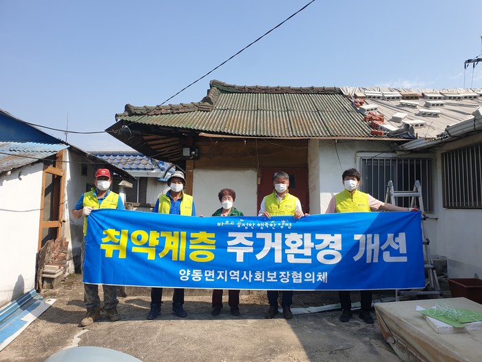 경기 양평군 양동면 지역사회보장협의체는 최근 나눔봉사의 일환으로 저소득층 주거환경개선사업을 실시해 주거환경이 열악한 홀몸노인 가구의 지붕 수리를 진행했다. 사진은 이날 참여한 봉사자들이 기념촬영을 하는 모습. (사진제공=양평군청)