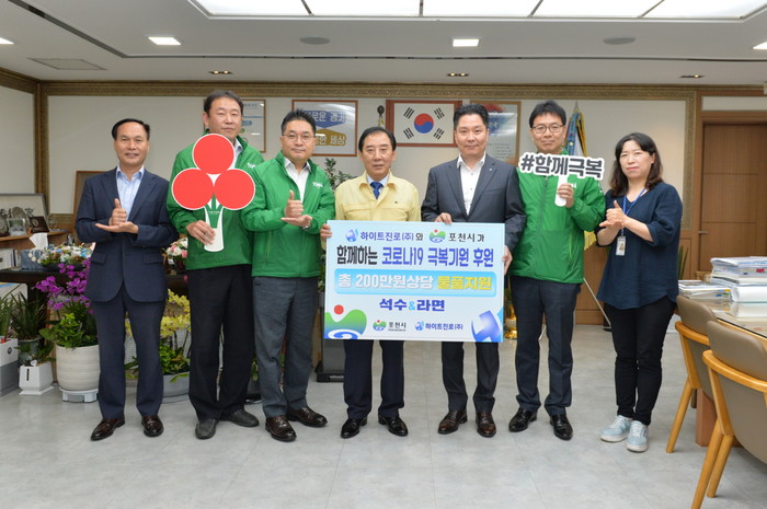 경기 포천시가 13일 하이트진로(주)로부터 코로나19로 어려움을 겪고 있는 이웃을 위한 라면 100상자 및 석수 100상자(200만원 상당)를 전달받았다. 사진은 이날 전달식에서 박윤국 시장(가운데)과 관계자들이 기념촬영을 하는 모습. (사진제공=포천시청)