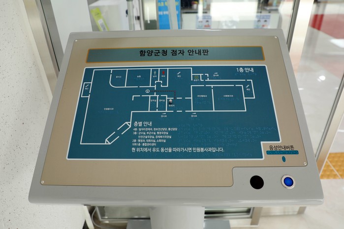 또한 이번 군청사 리모델링을 통하여 출입구 입구에 점자안내판과 대형 청사안내도를 설치하였으며, 본관 1층 장애인 화장실 내에도 도움벨을 설치하여 군청사 이용에 불편함이 없도록 하였다.