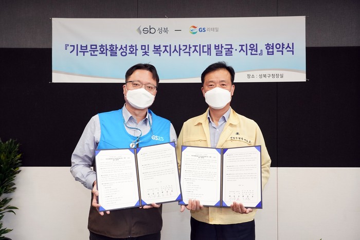 서울 성북구가 동네 골목골목에 있는 편의점을 활용해 위기가구 발굴과 지원에 나섰다. 이를 위해 최근 GS리테일 편의점사업부와 복지사각지대 발굴과 기부문화 활성화를 위한 업무협약을 체결했다. 사진은 협약 후 기념촬영을 하고 있는 이승로 구청장(오른쪽)과 전승호 부장의 모습. (사진제공=성북구청)