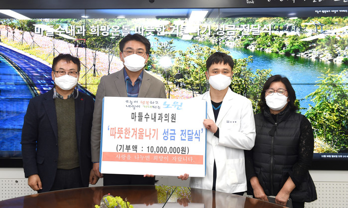 서울 노원구가 최근 마들수내과의원으로부터 '2021 희망온돌 따뜻한 겨울나기' 성금으로 1000만원을 전달받았다. 사진은 오승록 구청장(왼쪽 두 번째)이 성금을 전달 받은 후 양병혁 원장 등 관계자들과 기념촬영을 하는 모습. (사진제공=노원구청)