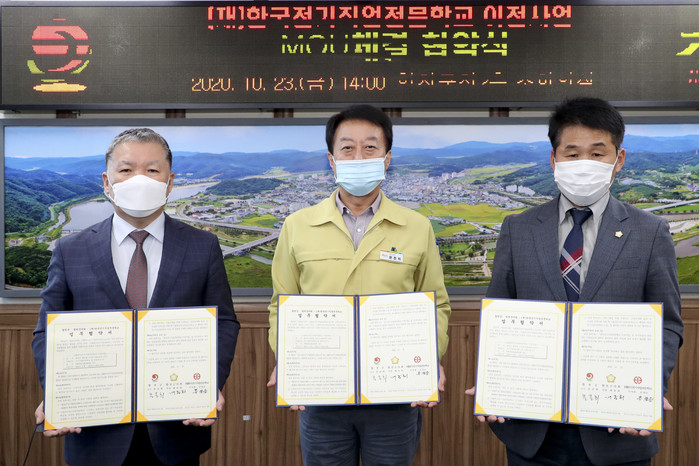 합천군(군수 문준희)과 합천군의회(의장 배몽희), (재)한국전기직업전문학교(이사장 문창순)은 23일 합천군청 2층 소회의실에서 문준희 군수, 합천군의회 배몽희 의장, 문창순 이사장를 비롯한 관계자 등 10여명이 참석한 가운데 ‘재단법인 한국전기직업전문학교 이전사업’을 위한 업무협약을 체결했다.