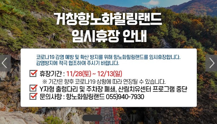 경남 거창군은 코로나19 방역관리에 선제적으로 대응하기 위해 오는 28일부터 12월 13일까지 거창항노화힐링랜드를 임시휴장한다.