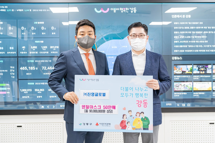 서울 강동구는 3일 진영글로벌 주식회사로부터 9000만원 상당의 덴탈마스크 50만장을 후원받았다. 구는 이 마스크를 아동양육시설, 노인종합복지관 등 지역내 사회복지시설과 저소득 취약계층 주민에게 전달할 예정이다. 사진은 전달식에서 이정훈 구청장(오른쪽)과 관계자가 기념촬영을 하는 모습. (사진제공=강동구청)