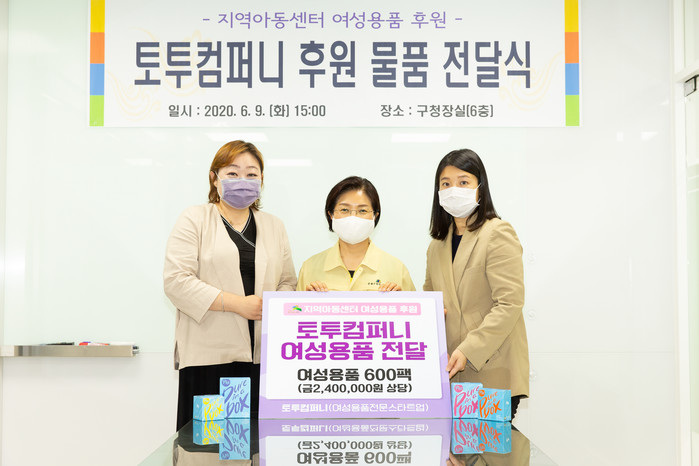 서울 은평구가 최근 토투컴퍼니로부터 저소득아동에게 지원할 여성용품 600팩을 전달받았다. 사진은 여성용품을 전달받은 김미경 구청장(가운데)가 이재현 지역아동센터 연합회장(왼쪽), 토투컴퍼니 남수미 대표와 기념촬영을 하고 있는 모습. (사진제공=은평구청)