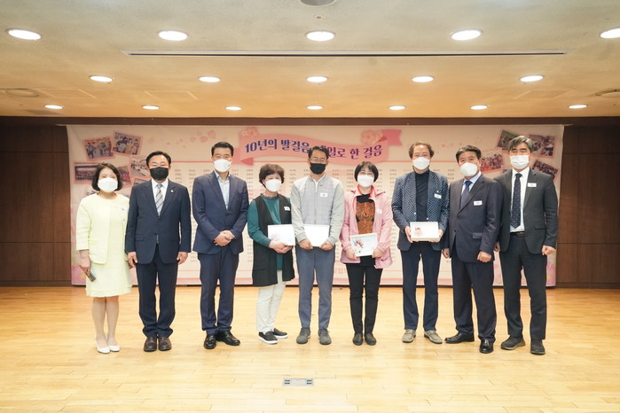 서울 성북구가 지난 11일 동 지역사회보장협의체 구성 10주년 기념식 및 워크숍을 개최했다. 기념식에서는 동협의체 최초 구성일로부터 활동해온 위원 90명에게 감사장을 수여하고, 정릉1동 이건평 위원에게 감사 꽃다발을 전달했다. 사진은 기념식에서 이승로 구청장(왼쪽에서 세 번째)이 관계자들과 기념촬영을 하는 모습. (사진제공=성북구청)