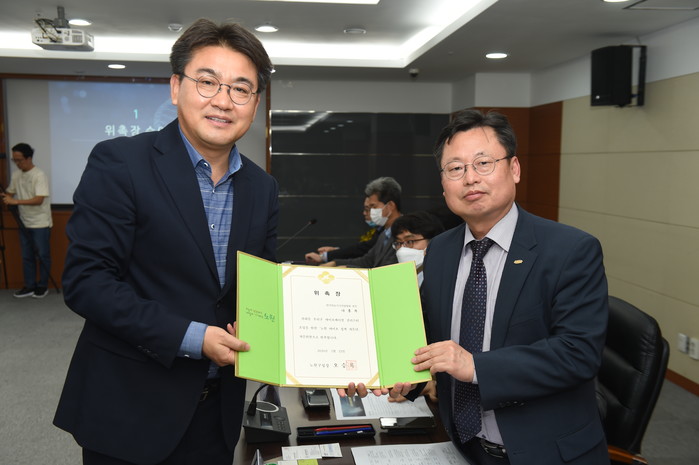 서울 노원구가 최근 구청 기획상황실에서 ‘노원 바이오 정책자문단 위촉식’을 개최, 오승록 구청장을 비롯해 자문위원(7명) 등이 참석한 가운데 자문위원 위촉장 수여, 사업현황 보고 등을 했다. 사진은 오 구청장(왼쪽 네 번째)과 자문위원들이 기념촬영을 하는 모습. (사진제공=노원구청)