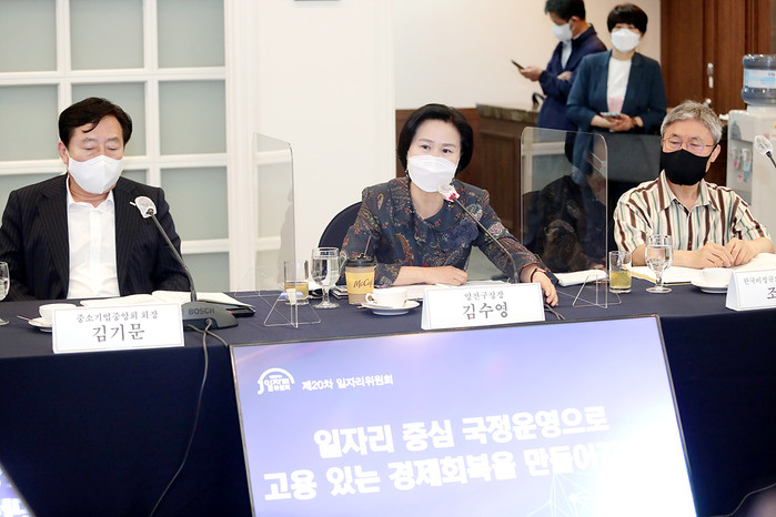 김수영 서울 양천구청장은 지난 18일 개최된 제20차 일자리위원회에 참석했다. 이번 회의는 ‘일자리 중심 국정운영으로 고용 있는 경제회복을 만들어갑시다’라는 주제로 진행됐으며, 김 구청장은 전국 지방정부를 대표해 대통령 직속 일자리 위원회의 위원으로 활동하고 있다. 사진은 일자리위원회에서 김 구청장(가운데)이 발언하고 있는 모습. (사진제공=양천구청)