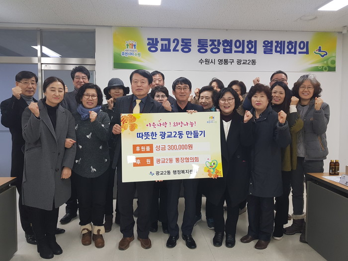 경기 수원시 영통구 광교2동 통장협의회는 지난 3일 어려운 이웃을 위해 사용해달라며 성금 30만원을 광교2동행정복지센터에 전달했다. 사진은 전달식에 참여한 관계자들이 기념촬영을 하는 모습. (사진제공=영통구청)