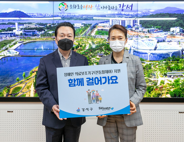 서울 강서구는 20일 (사)함께하는 사랑밭으로부터 장애인의 날 기념 후원물품으로 전동휠체어 10대를 기탁받았다. 전동휠체어는 지역내 도움이 필요한 장애인에게 전달될 예정이다. 사진은 전달식에서 노현송 구청장(왼쪽)이 관계자와 기념촬영을 하는 모습. (사진제공=강서구청)