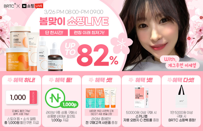 비알티씨 관계자는 “이번 방송에서 뷰튜버 이세영만의 피부 관리 꿀팁도 전수한다”며, “풍성한 경품 이벤트와 다양한 고객 혜택으로 구성된 이번 라이브 방송을 놓치지 않길 바란다”고 전했다.