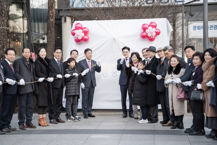 13일 서울 강동구가 강동아트센터 스튜디오#1에서 강동문화재단 출범식을 열고, ‘품격 있는 문화예술 도시’로의 도약을 알렸다. 사진은 제막식 후 기념촬영을 하고 있는 이정훈 구청장과 내빈들의 모습. (사진제공=강동구청)