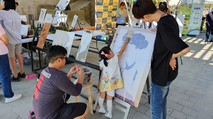 서울 도봉구는 최근 평화문화진지 잔디광장에서 지역 대표 위인 전형필 선생과 함석헌 선생이 살던 시대를 다양한 문화예술 장르로 풀어낸 평화문화콘서트 ‘씨알의 소리’를 개최했다. 사진은 행사에 참여한 어린이가 미인도 퍼즐을 맞추고 있는 모습. (사진제공=도봉구청)