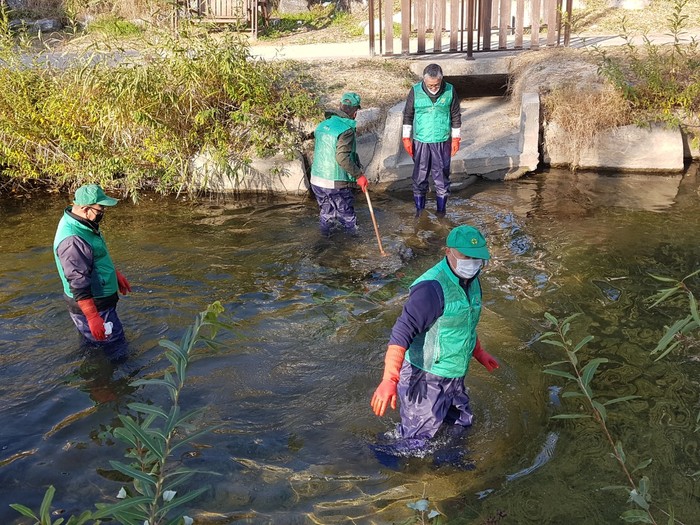 경기 수원시 권선구 세류3동 새마을협의회는 30일 주민들이 많이 왕래하는 수원천 수질정화 활동을 전개해 유천1교~버들교에서 쓰레기를 치우고 산책로 주변을 환경정비했다. 사진은 이날 봉사자들이 수원천 내부에 쌓인 쓰레기를 치우고 있는 모습. (사진제공=권선구청)