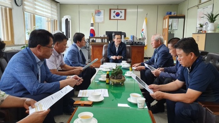 이항진 경기 여주시장은 4일 금사면에서 ‘1박2일 마을회관 소통투어 시즌2’ 다섯 번째 행보를 이어나갔다. 이날 이 시장은 행정복지센터에서 관계자들과 회의를 한 후 지역내 홀몸노인 2가구 등을 방문했다. 사진은 관계자들과 회의를 하는 모습. (사진제공=여주시청)