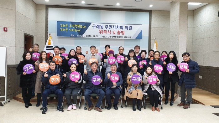 경기 김포시 구래동 주민자치회가 지난 28일 구래동 행정복지센터에서 주민자치회 위원 위촉식을 개최하고 공개모집 및 심사, 추천 등을 통해 구성된 주민자치회 위원 30명에게 위촉장을 수여했다. 사진은 위원들이 기념촬영을 하는 모습. (사진제공=김포시청)