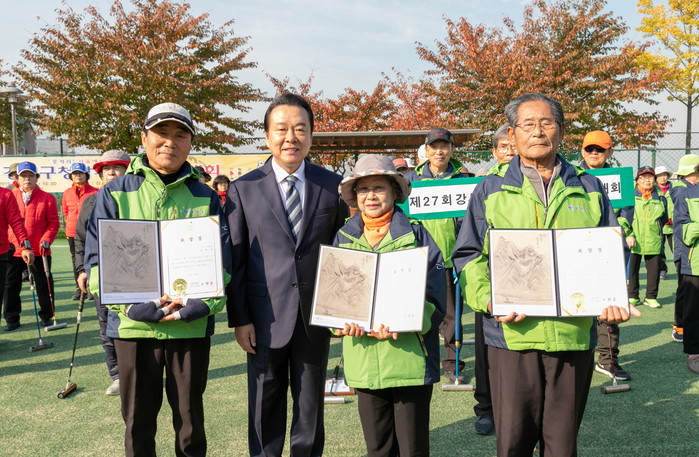 서울 강서구는 게이트볼 저변 확대를 위해 6일 까치산 근린공원에서 ‘제27회 강서구청장기 게이트볼대회’를 개최했다. 사진은 노현송 구청장(왼쪽에서 두 번째)이 게이트볼 발전에 기여한 공로자들에게 표창장을 수여한 후 함께 기념촬영을 하는 모습. (사진제공=강서구청)