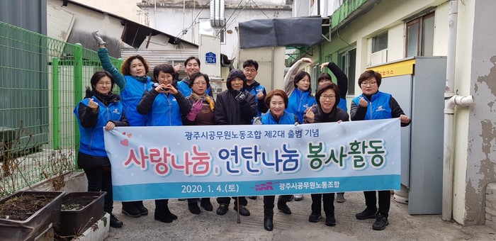 경기 광주시공무원노동조합이 최근 제2대 출범식을 대신해 '사랑나눔 연탄나눔' 봉사활동을 했다. 이날 김순미 위원장을 비롯해 새롭게 구성된 노조 임원들은 송정동과 곤지암읍의 홀몸노인을 위해 연탄 1000장을 직접 배달했다. 사진은 기념촬영 모습. (사진제공=광주시청)