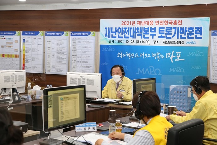 서울 마포구가 최근 ‘2021 마포구 재난대응 안전한국훈련’을 실시해 복합적인 재난상황을 가상하고 재난 대처 사항을 비대면 토론방식으로 진행했다. 사진은 유동균 마포구 재난안전대책본부장(가운데)이 안전한국훈련 토론 기반 훈련을 진행하고 있는 모습. (사진제공=마포구청)