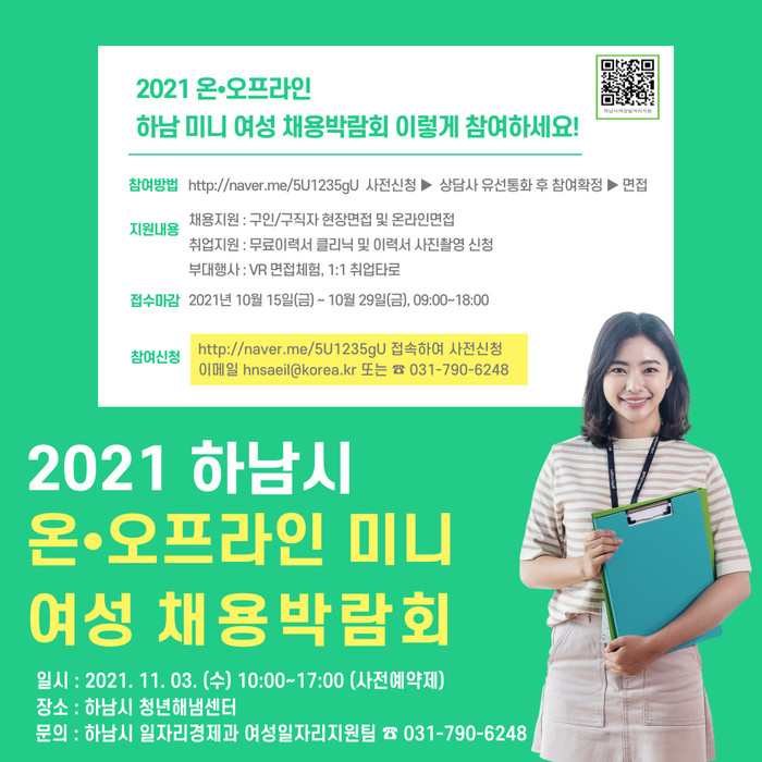 채용박람회 참여를 희망하는 여성 구직자는 사전신청을 하고 신분증과 이력서를 준비해 오는 3일 오전 10시~오후 5시 청년해냄센터(하남시 미사강변대로 84 미사탑프라자 5층)로 방문하면 된다.