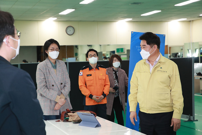관악구가 6일 관악구민종합체육관에 설치된 관악구 예방접종센터에서 모의훈련 평가를 실시해 가상접종 및 운영절차, 이상반응 대응을 중점적으로 점검했다. 사진은 모의훈련에서 박준희 구청장(오른쪽)이 직원들을 격려하고 있는 모습. (사진제공=관악구청)
