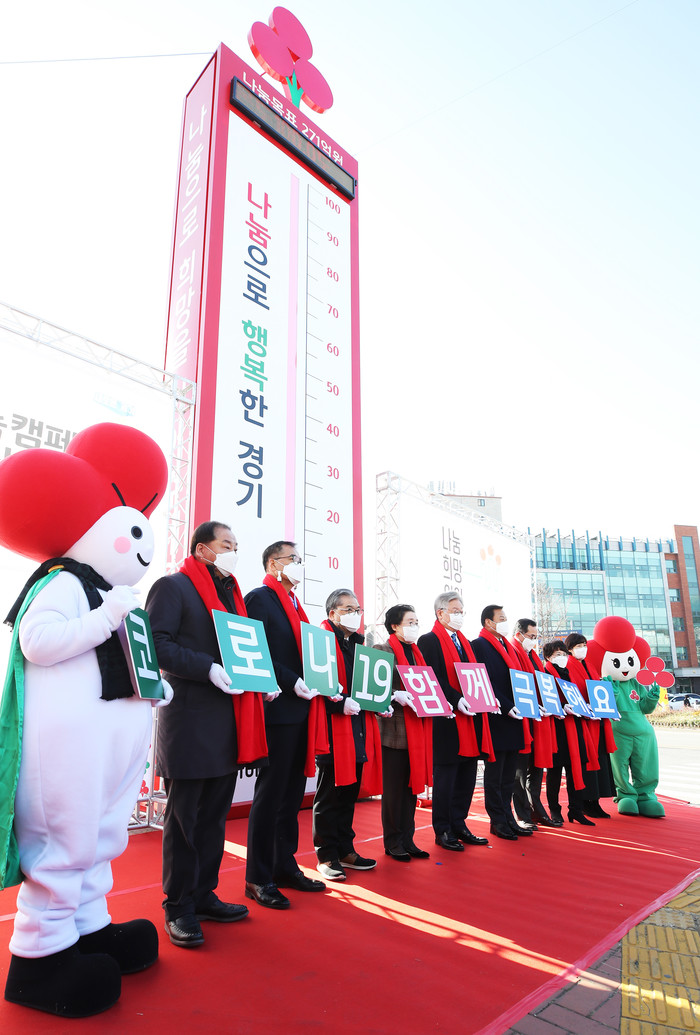 1일 오전 경기 수원시 도청오거리에서 열린 '희망 2021 나눔캠페인 출범식 및 사랑의 온도탑 제막식'에서 이재명 경기도지사, 장현국 경기도의회 의장, 이재정 경기도교육감, 이순선 경기사회복지공동모금회 회장을 비롯한 참석자들이 기념촬영을 하고 있다.