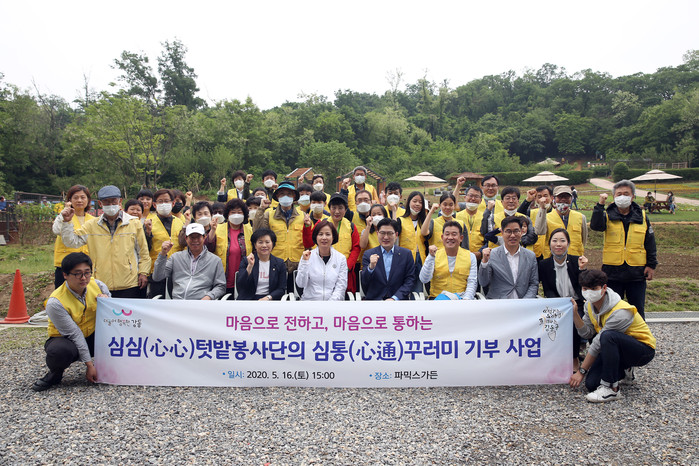 지난 16일 이정훈 서울 강동구청장이 파믹스가든(상일동 145-6) 개장 행사에 참석했다. 이날 행사는 파믹스가든 조성 경과보고를 시작으로 심심(心心)텃밭봉사단 발대식, 파믹스가든 제막식과 투어가 진행됐다. 사진은 행사 참석자들과 기념촬영을 하고 있는 이 구청장(앞줄 가운데)의 모습. (사진제공=강동구청)