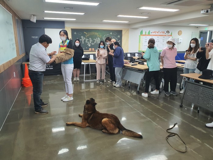 | ▲ 강동구 유기동물 분양센터 ‘리본’에서 반려견 행동전문가 양성과정 이론 및 실습교육이 진행되고 있는 모습. (사진제공=강동구청) |