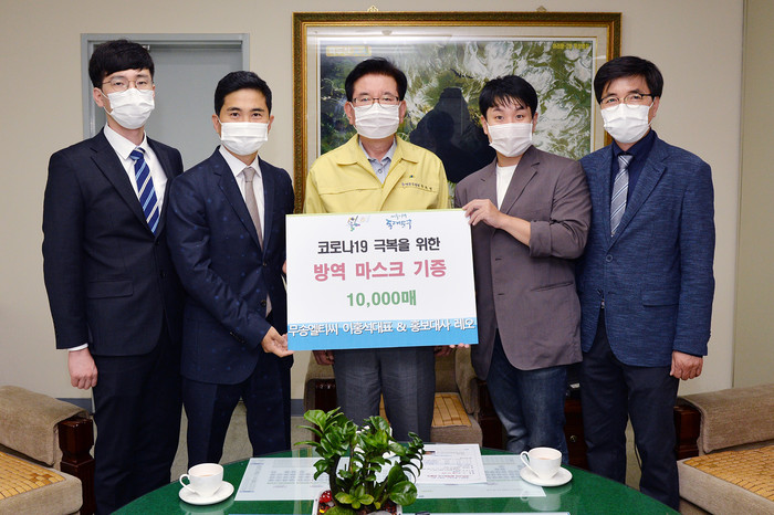 서울 동대문구는 5일 동대문구 홍보대사로 활동 중인 마술사 레오와 무송엘티씨로부터 코로나19 극복을 위한 방역 마스크 1만장을 전달받았다. 사진은 유덕열 구청장(가운데)과 마술사 레오(오른쪽에서 두 번째), 이홍석 무송엘티씨 대표(왼쪽에서 두 번째) 및 관계자들이 기념촬영을 하고 있는 모습. (사진제공=동대문구청)