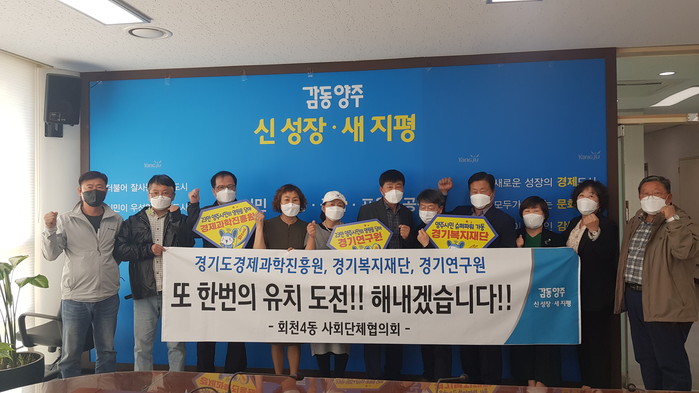 경기 양주시 회천4동 사회단체협의회는 지난 9일 15개 사회단체와 함께 공공기관 이전 유치 염원을 담은 결의대회를 실시해 경기도 공공기관의 양주시 이전을 촉구하는 결의문을 낭독했다. 사진은 이날 공공기관유치결의 캠페인에 참여한 단체장들이 기념촬영을 하는 모습. (사진제공=양주시청)