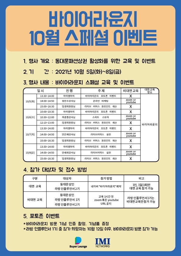 이벤트는 동대문 상인과 바이어라운지 소속 1, 2기 인플루언서를 대상으로 온라인 마케팅, 스마트 스토어 운영, 라이브커머스 실전 전략을 주제로 4명의 전문 강사들이 동대문 바이어라운지(DDP패션몰 4층)에서 강의를 진행한다. 강의는 유튜브 라이브로도 생중계되어 누구나 시청할 수 있다.