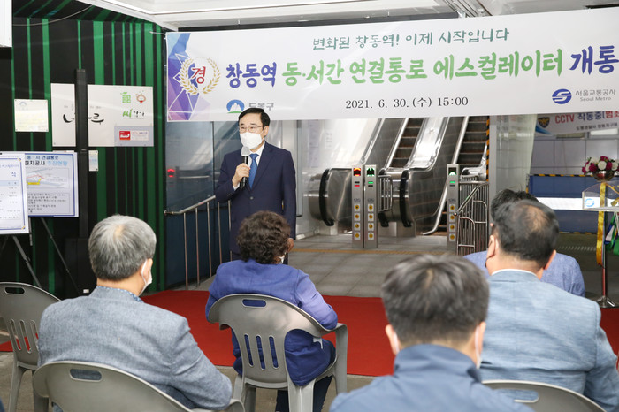 서울 도봉구는 30일 창동역 동·서간 연결통로에 에스컬레이터 4기를 설치하고 개통식을 열었다. 기존 창동역 동·서간 연결통로는 계단만 설치돼 있어 장애인 등 교통약자가 이용하기엔 불편한 구조였다. 사진은 개통식에서 이동진 구청장(가운데)이 인사말을 하는 모습. (사진제공=도봉구청)